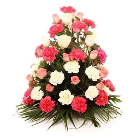 send this beautiful basket arrangement of 40 mix colour flowers including 16 pink carnations, 6 white carnations, 12 pink roses and 6 white roses