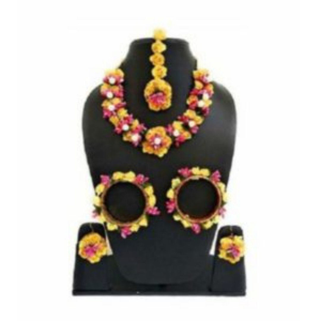 Pink and Yellow Flower Jewellery for Haldi Ceremony